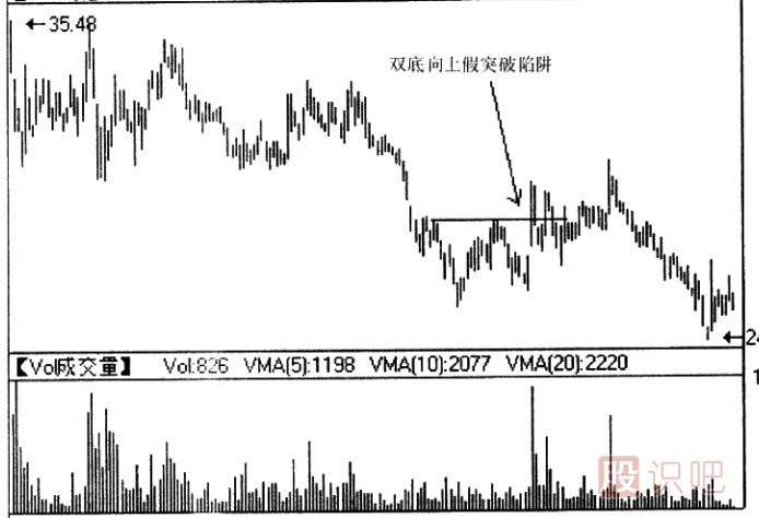 在雙底形態(tài)形成過(guò)程中,股價(jià)未構(gòu)成對(duì)頸線的有效突破,就可能形成雙底陷阱。通常,雙底陷阱有兩種類(lèi)型: