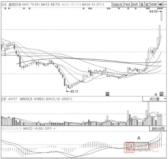 圖4-7是新宏澤(002836)的日線圖。圖中,在KDJ指標經(jīng)歷了A段50線以上的向上運行后,J線在位于K線和D線之上運行的情況下,在M區(qū)域出現(xiàn)了向下與K線和D線的交叉,形成了KDJ“死叉”,說明股價即將轉(zhuǎn)為下跌趨勢,因此投資者在此時賣出股票。